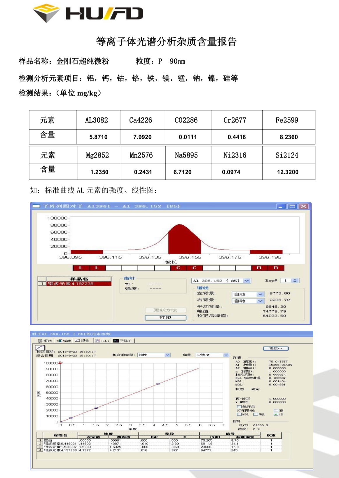 目前,公司通過破碎法和高效的表面提純工藝,批量生產(chǎn)納米金剛石,其具有粒度分布集中、超純和良好的分散性等特性(如圖1、圖2、圖3),在拋光、流體導(dǎo)熱、油墨、醫(yī)學(xué)領(lǐng)域已得到良好的應(yīng)用效果,進(jìn)一步推動了高端微粉發(fā)展應(yīng)用。